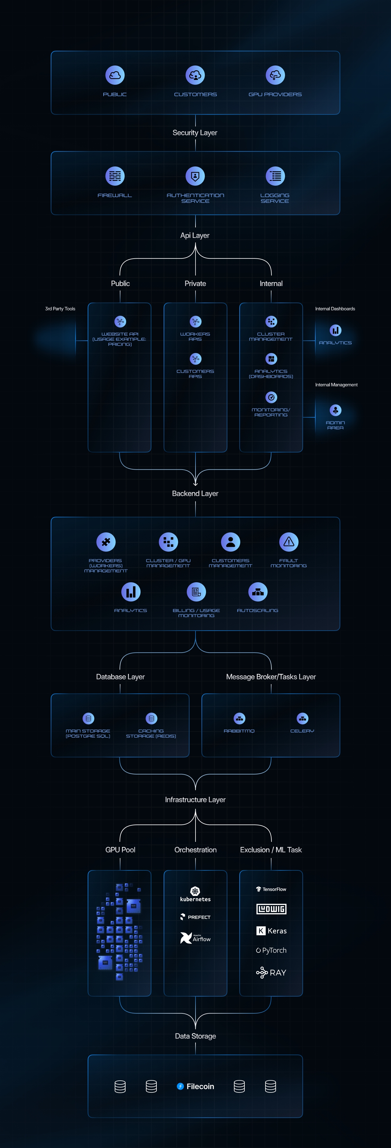 This layer is the visual gateway for users. It comprises the Public website, Customers area, and GPU providers area (Workers). The design is intuitive and user-centric, ensuring easy navigation and interaction.